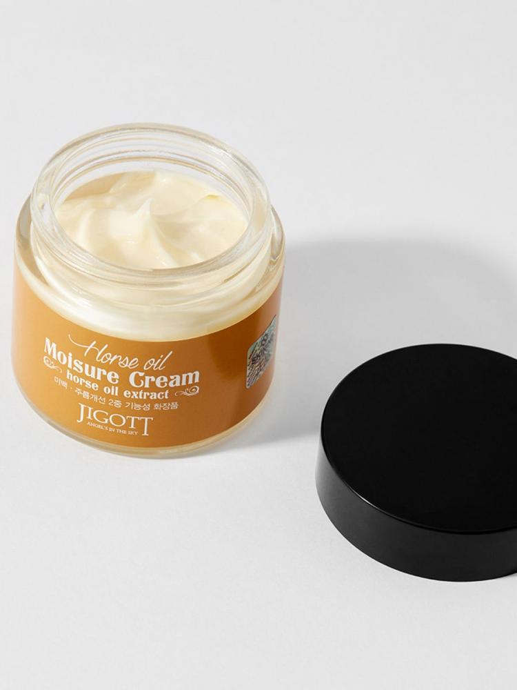 HORSE OIL MOISTURE CREAM Крем для лица ТМ JIGOTT Крем на основе лошадиного жира богат ненасыщенными жирными кислотами, содержит витамины, большое количество белка и оказывает увлажняющее и восстанавливающее действие, снимает воспаления, устраняет шелушения, стимулирует регенерацию, а также замедляет процессы старения. Аллантоин и растительный комплекс из экстрактов зеленого чая и листьев алое оказывают противовоспалительное действие, успокаивают кожу и стимулируют процессы регенерации. Ниацинамид и аденозин осветляют, повышают эластичность и дарят сияние коже.