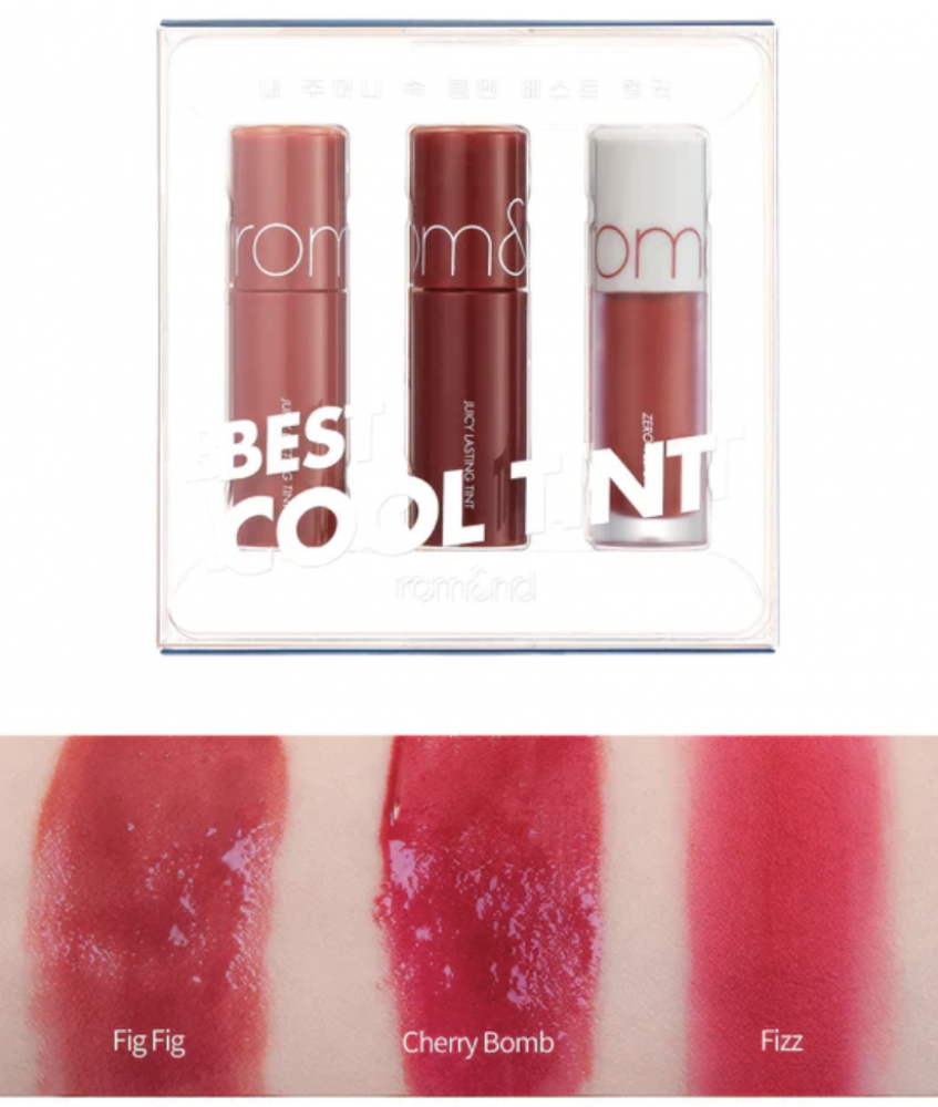 Набор мини-тинтов бестселлеров от rom&nd в холодных тонах #02 Cool Tone Pick. В комплекс входят три мини-тинта, которые помещены в пластиковую коробочку. Благодаря мини-формату, тинты очень удобно взять с собой в дорогу.