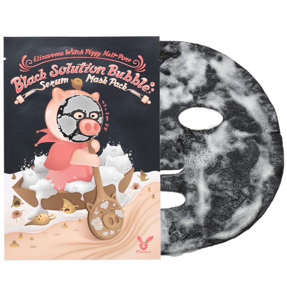 Антивозрастная кислородная маска Elizavecca Black Solution Bubble Serum Mask Pack мягко отшелушивает и удаляет ороговевшие клетки кожи, глубоко очищает поры, улучшает цвет лица и способствует разглаживанию морщин. При взаимодействии с воздухом тканевая маска начинается пениться и эффективно очищать кожу.